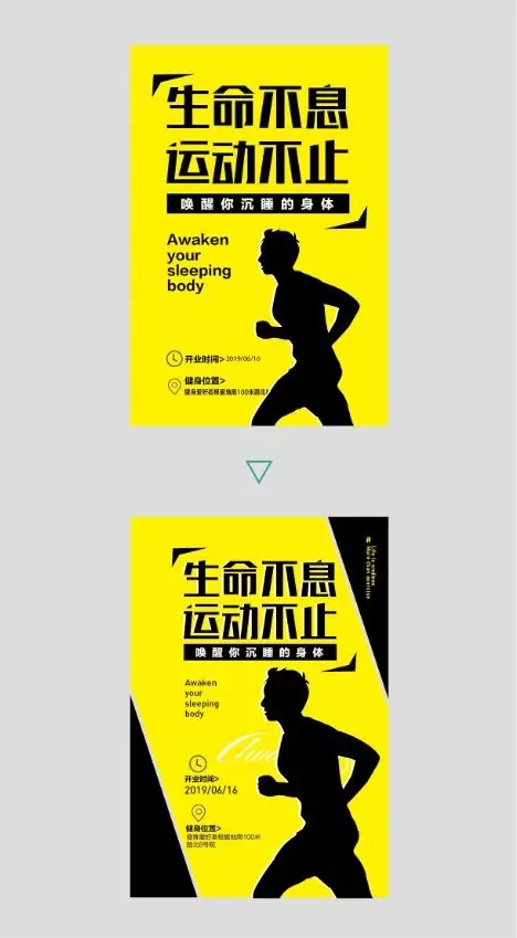 整个画面的文字和图像都已经有了,开始进行色彩搭配。要营造视觉冲击力,并符合运动感,我们选择明黄色和黑色的搭配,明黄色代表活泼奔放,黑色则代表力量感。