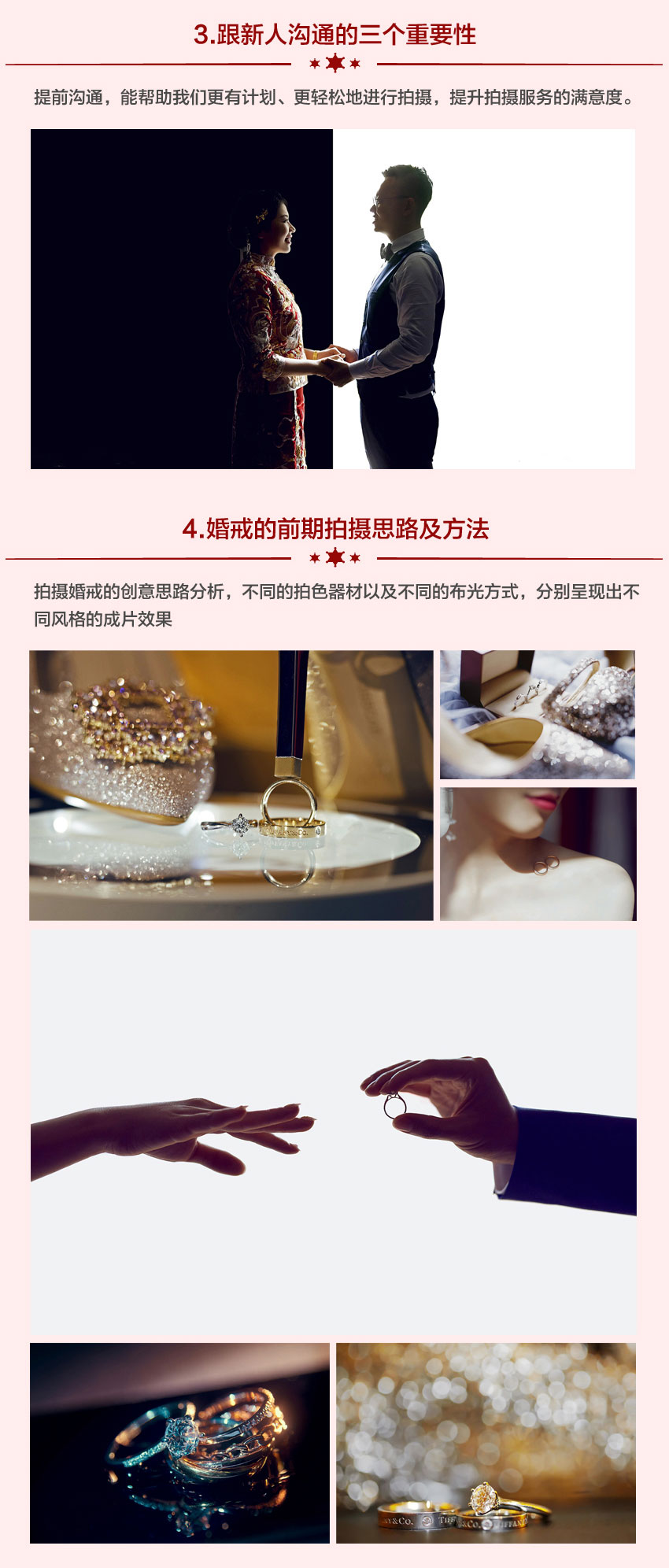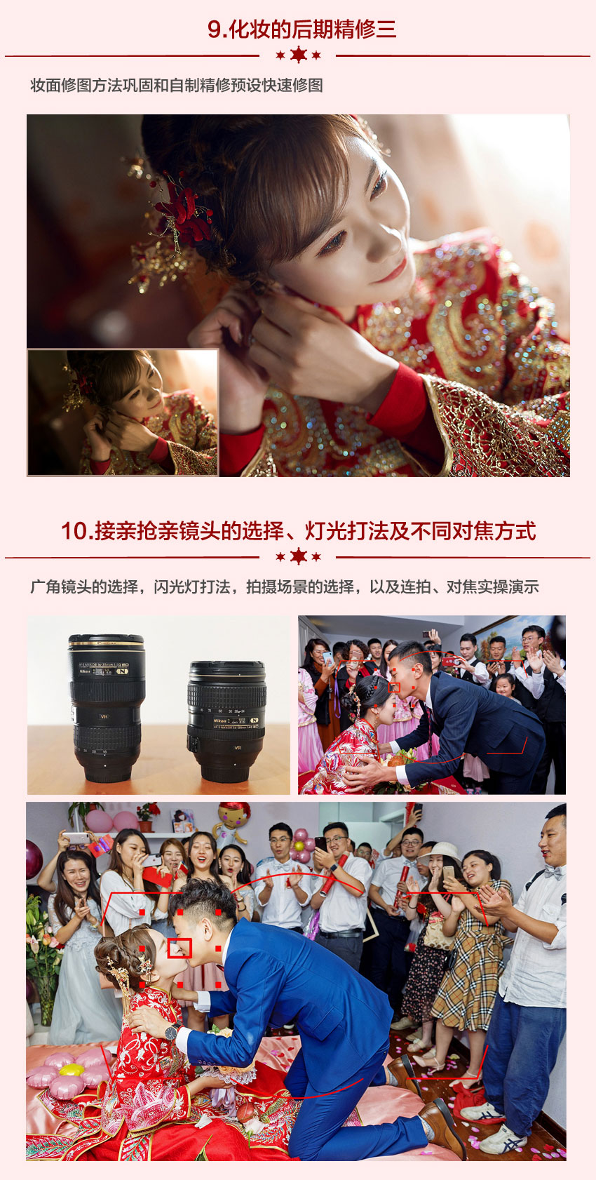 本套婚礼跟拍课程是一套系统完整的婚礼摄影及后期修图课程。内容包含摄影器材的选择,婚礼各个环节例如,戒指、新娘化妆、接亲抢亲、敬茶、婚礼仪式等不同环境下的镜头选择,及布光要点。